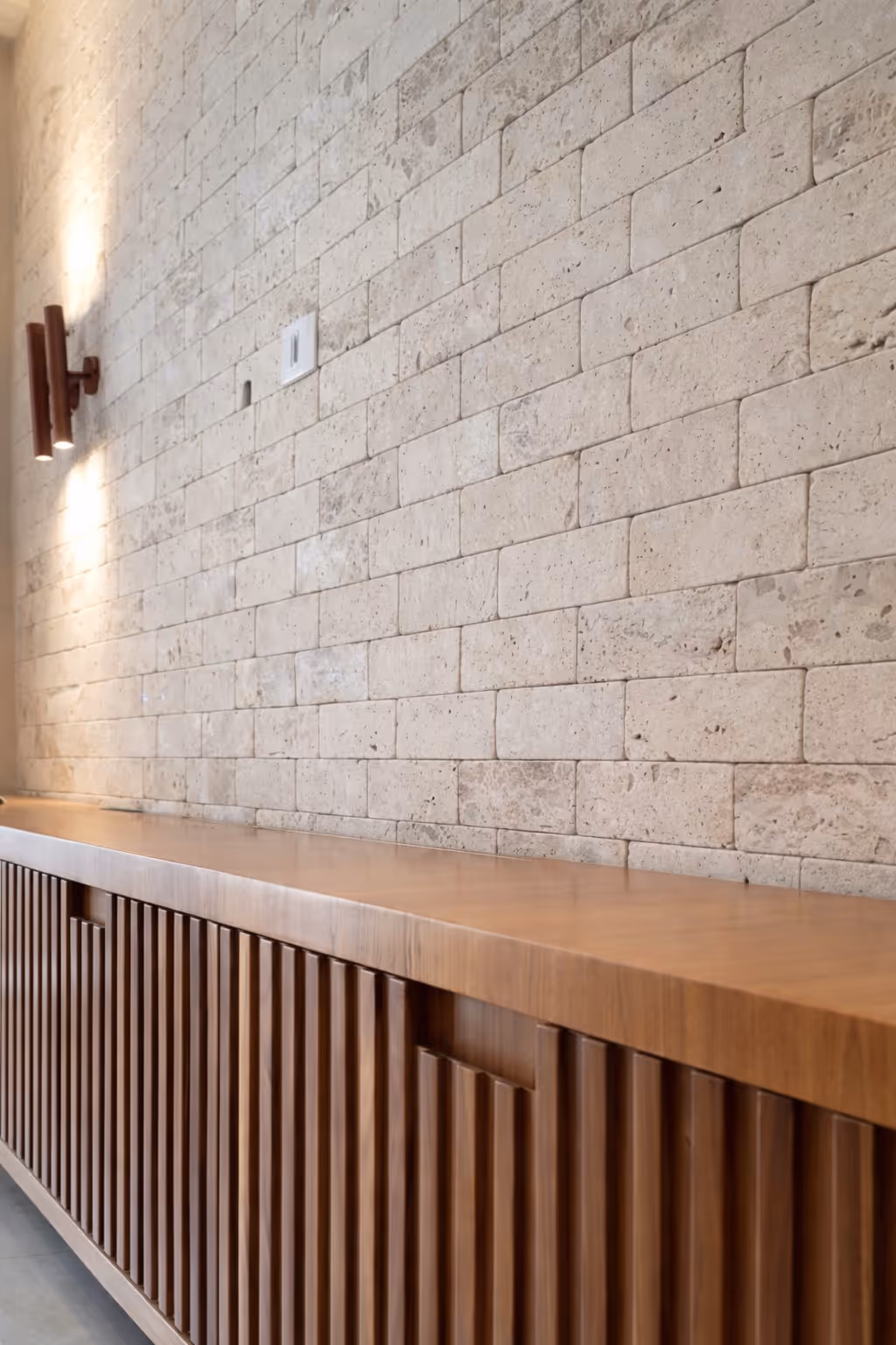 Linha Moledo: Peças orgânicas e irregulares montadas artesanalmente para criar superfícies únicas e sem repetição de desenho. A marca oferece as variações Travertino, de estética autêntica e viva , e La Roccia, com espessura controlada para projetos que buscam impacto com sofisticação.