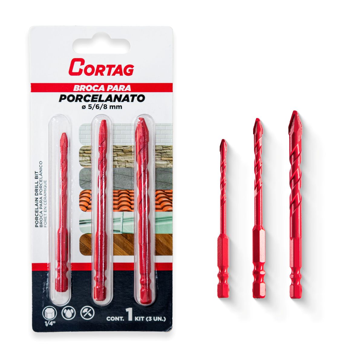 E não para por aí! Confira também a linha de Brocas para Porcelanato Cortag. Ela é a solução mais eficiente do mercado pois entrega perfuração precisa, limpa e com acabamento profissional. Sua ponta de alta dureza evita lascas e desvios, enquanto o design permite o resfriamento adequado do material e oferece estabilidade desde o início do furo.