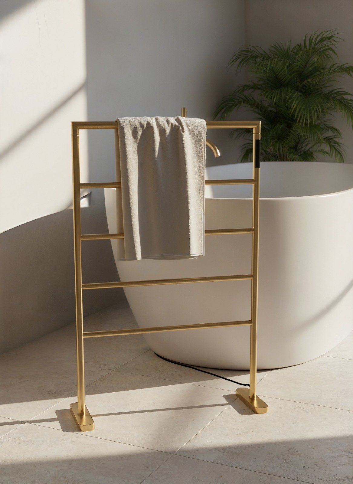 Toalheiros Térmicos: Expansão da linha premiada com modelos sobrepostos, articulados e de piso, disponíveis em acabamentos sofisticados como Brushed Gold e GunMetal.